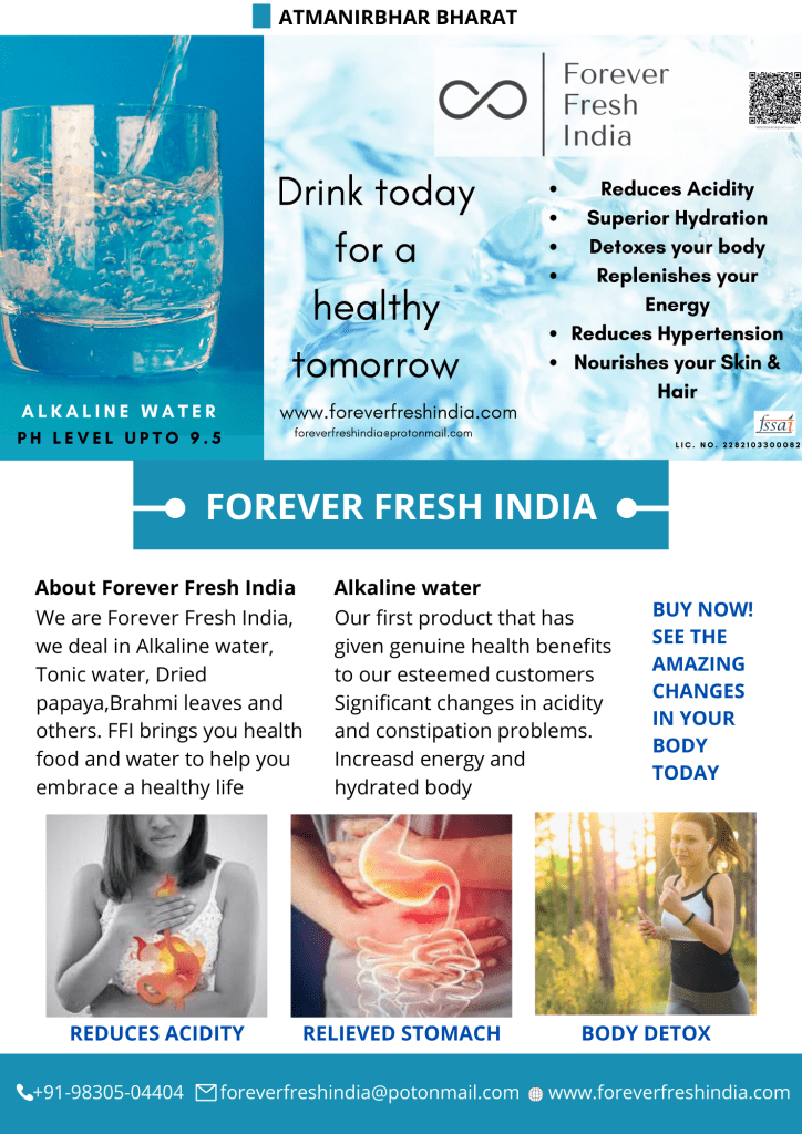 We are Forever Fresh India, we deal in Alkaline water, Tonic water, Dried papaya, Brahmi leaves, and others. FFI brings you healthy food and water to help you embrace a healthy life